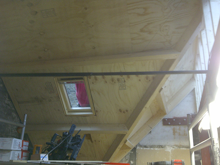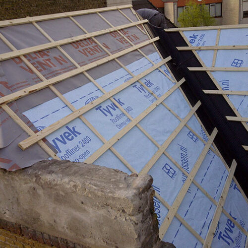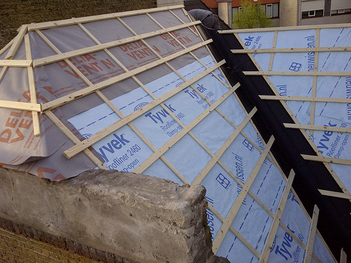De complete dakconstructie is bij deze woning vervangen. Waarna er een nieuw dakbeschot op aangebracht is, een waterkerende damp-open laag en pannen. In de kilgoten is een kunststof kilgoot van ubbink toegepast, de overige goten en h.w.a.’s zijn in zink uitgevoerd. Later is er aan de binnenzijde van het dak isolatie toegepast