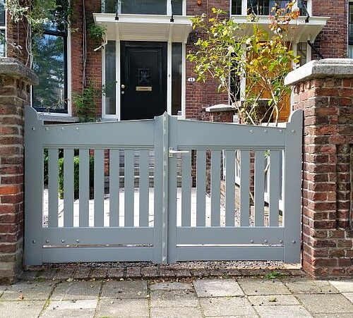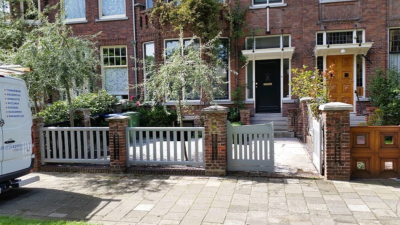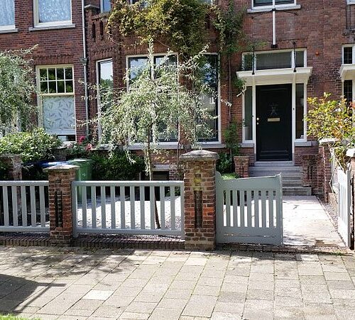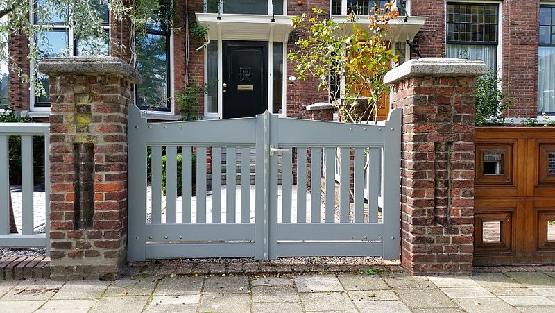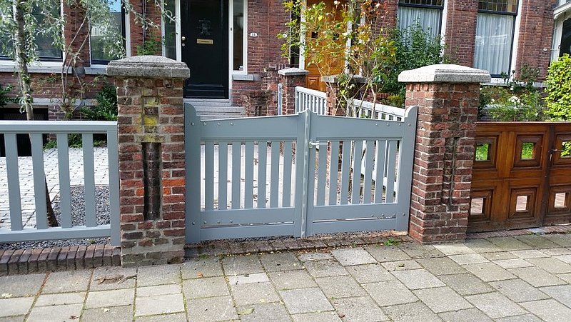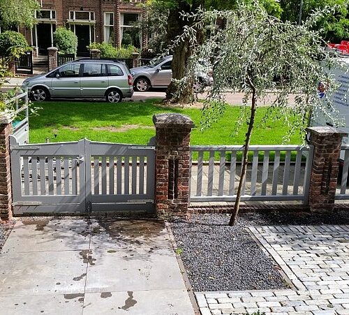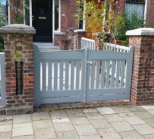 De bestaande houten hekwerken tussen de gemetselde palen waren ernstig aangetast door houtrot en de draaihekken ontbraken in hun geheel. Wij hebben de originele maten en uitstraling kunnen achterhalen en zo de erfafscheiding weer in de oude staat kunnen herstellen. De hekken zij vervaardigd bij Otterspeer en de Jong en uitgevoerd in dark red meranti